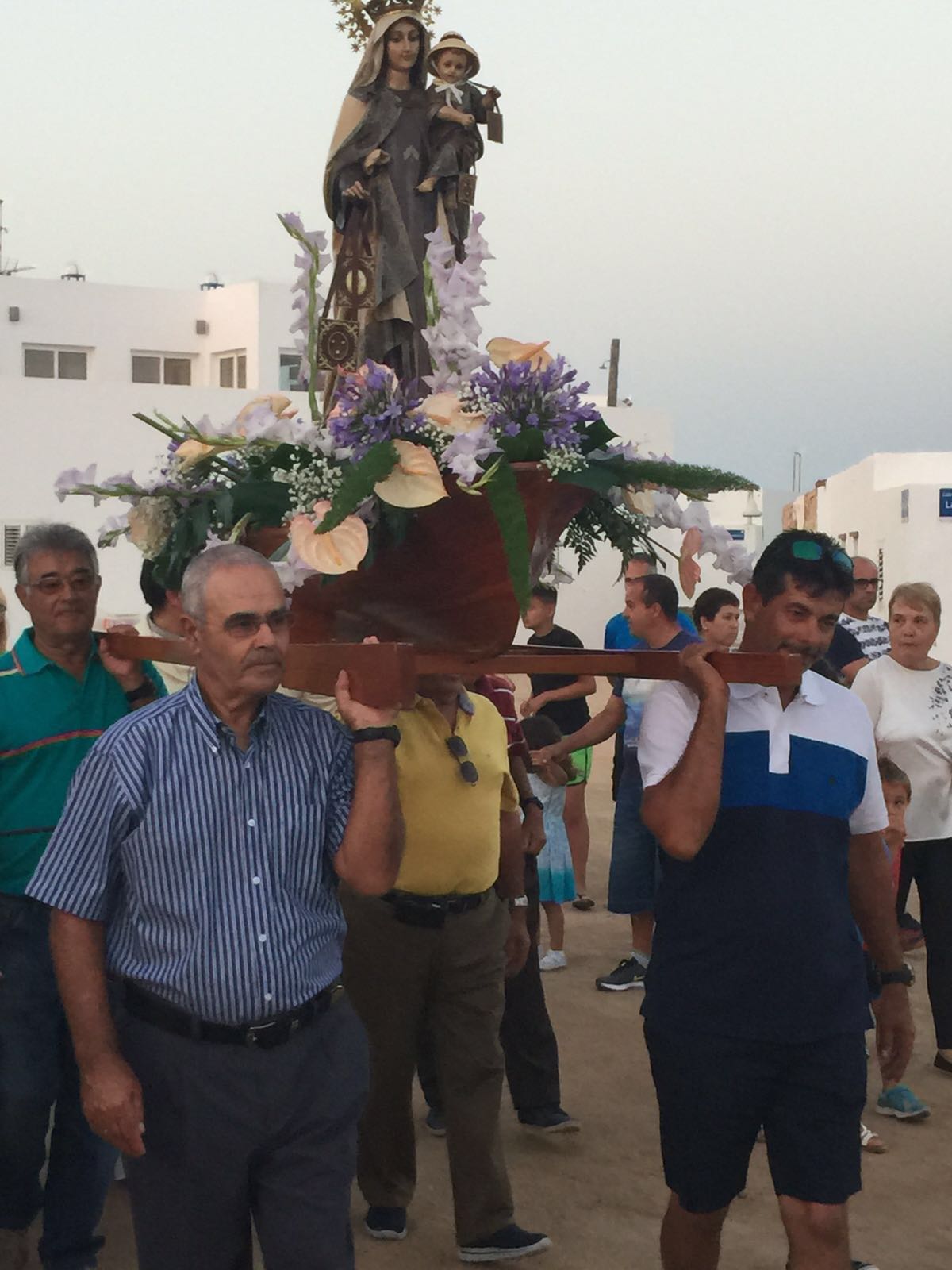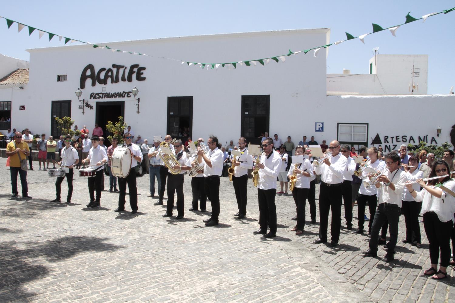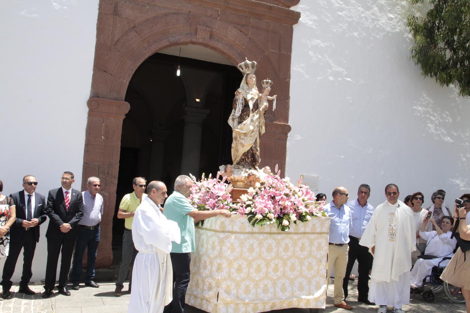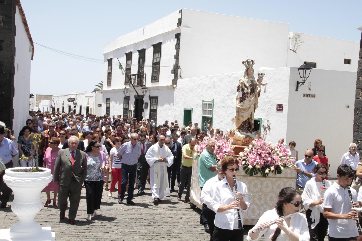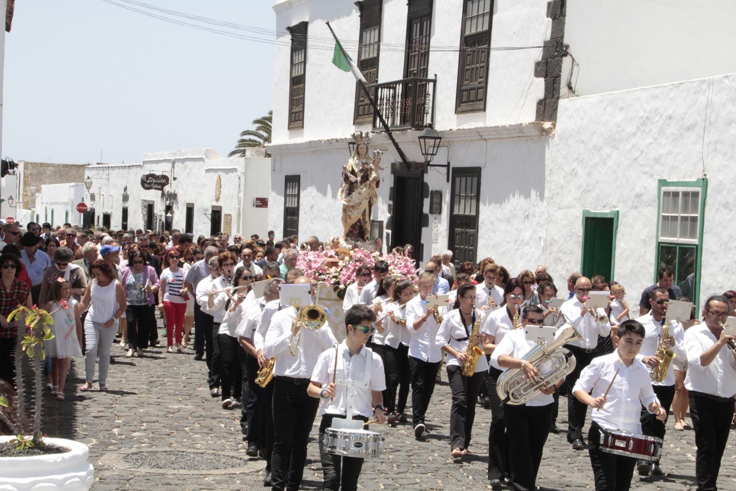 Una vez finalizada la Santa Misa, se puso en marcha el cortejo procesional. Cuando la imagen de Nuestra Señora del Carmen traspasó el pórtico de la iglesia, el público la recibió con un prolongado aplauso. Acto seguido la banda de música de Teguise, que encabezaba la procesión, se encargó de marcar el paso procesional interpretando varias composiciones propias para estos actos.