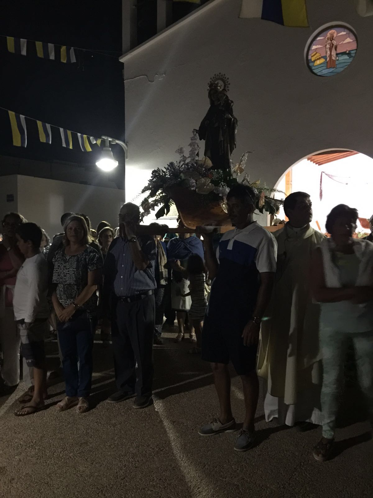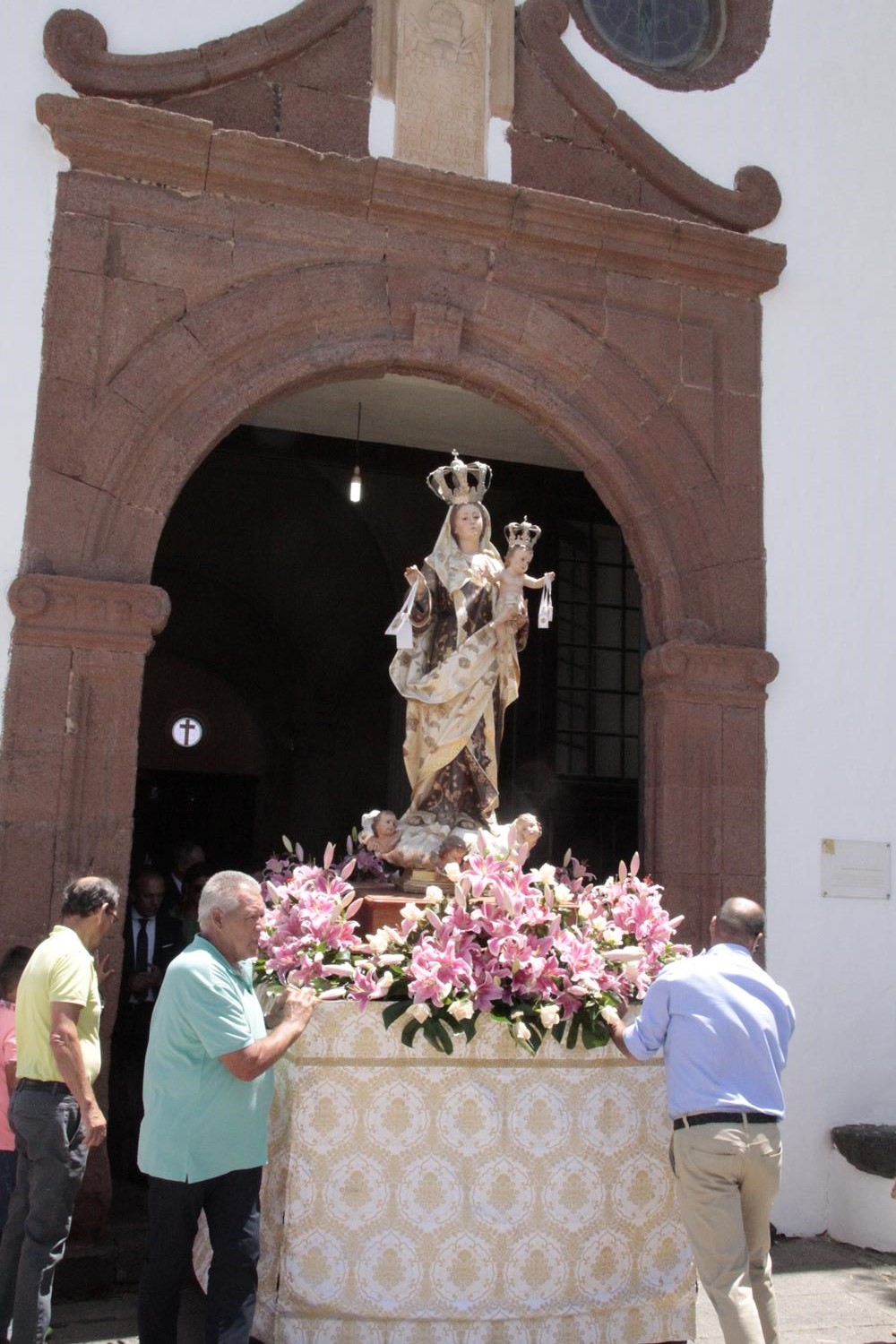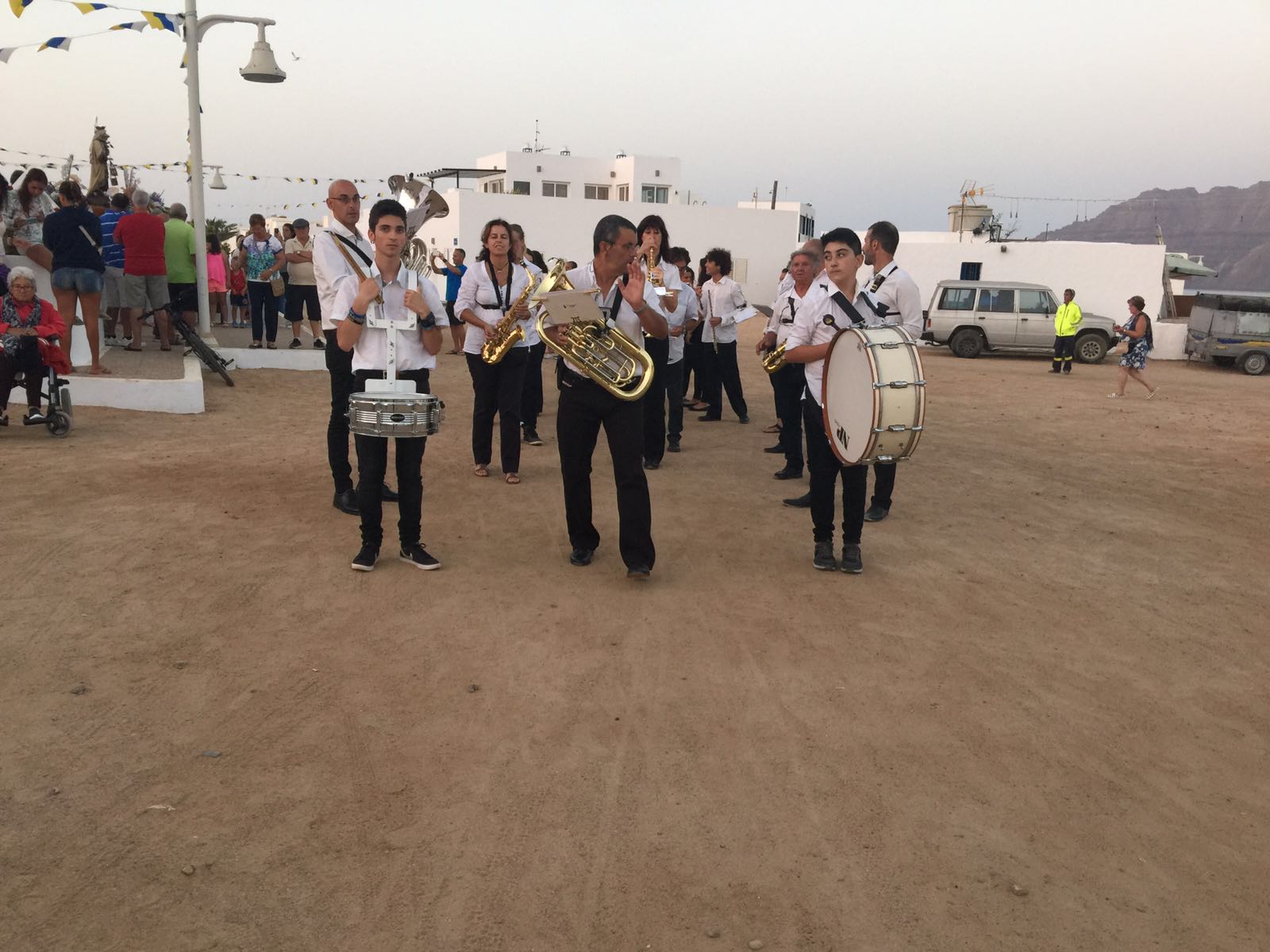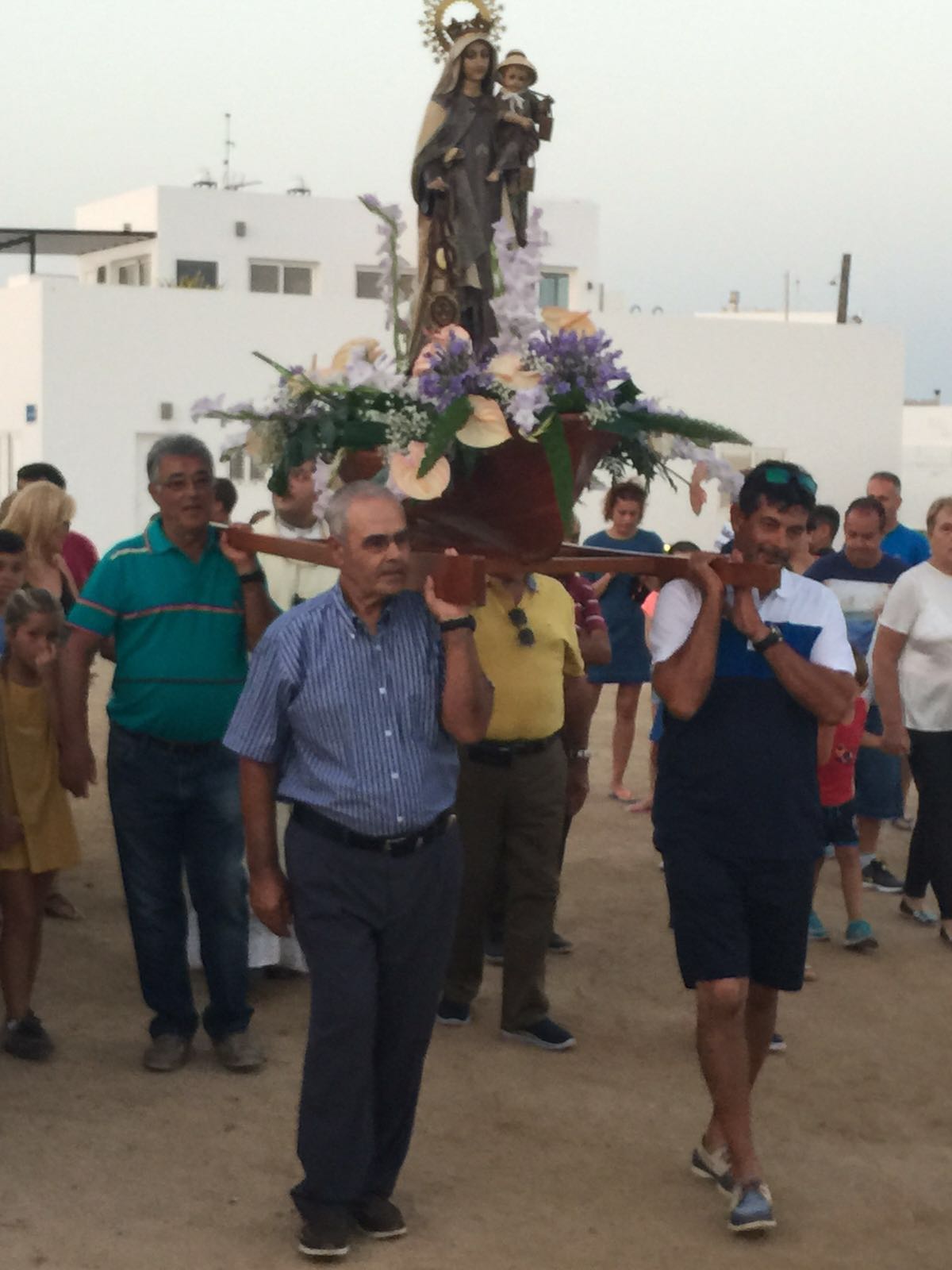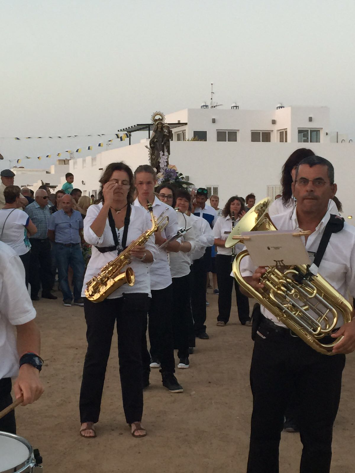 Una vez finalizada la Santa Misa, se puso en marcha el cortejo procesional. Cuando la imagen de Nuestra Señora del Carmen traspasó el pórtico de la iglesia, el público la recibió con un prolongado aplauso. Acto seguido la banda de música de Teguise, que encabezaba la procesión, se encargó de marcar el paso procesional interpretando varias composiciones propias para estos actos.