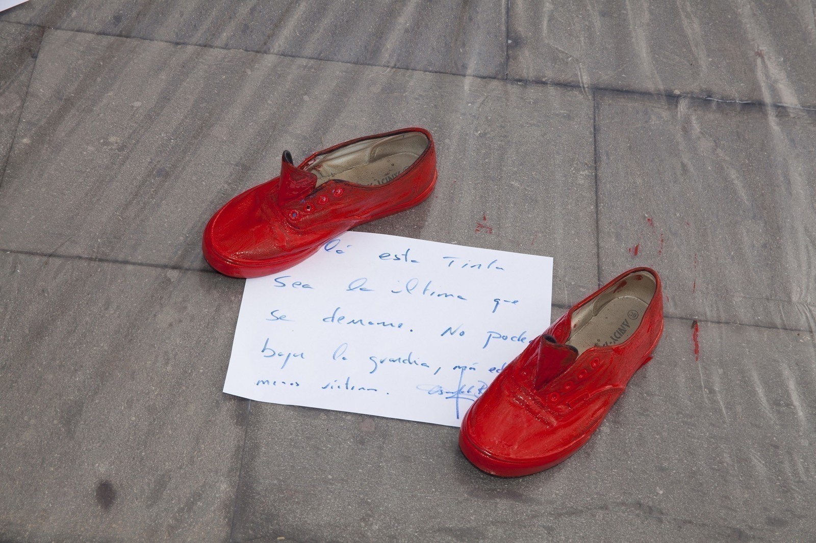 La pintada se realizó al aire libre, contando con la participación de las personas que se acercaron a escribir mensajes y palabras de aliento, dejándolo junto a cada par de zapatos rojos, que simboliza la desaparición de una mujer.
